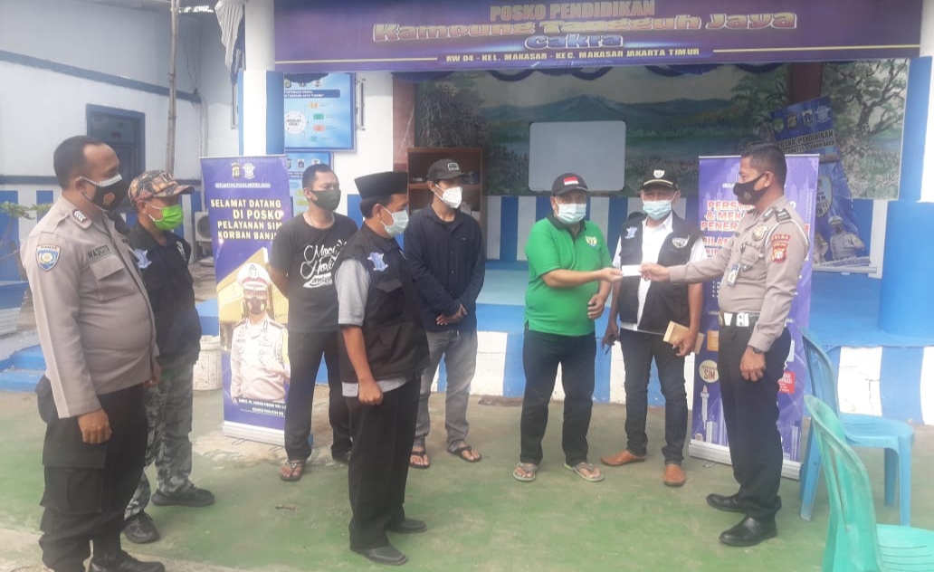 JAKARTA: Satpas SIM Polda Metro Jaya peduli membuka pelayanan penerbitan SIM hilang/rusak bagi korban banjir di RW 4 Kelurahan Makasar, Jakarta Timur, Sabtu (27/2/2021).