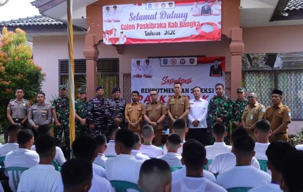 Sungailiat – Pemerintah Kabupaten Bangka menggelar rekrutmen dan seleksi Pasukan Pengibar Bendera Pusaka (Paskibraka) Tahun 2026 di halaman Kantor Bankesbangpol Kabupaten Bangka, Senin (06/04/2026). Kegiatan tersebut dibuka langsung oleh Wakil Bupati Bangka Syahbudin S.IP M.Tr.Ip serta dihadiri para pelatih dan petugas seleksi dari anggota TNI, Polri dan PPI (Purna Paskibraka Indonesia) dan para calon peserta seleksi Paskibraka dari perwakilan siswa SMK/SMA se Kabupaten Bangka. Dalam sambutanya Wakil Bupati Bangka, Syahbudin mengharapkan agar rekrutmen dan seleksi ini bisa mendapatkan calon anggota Paskibraka Kabupaten Bangka yang akan menjalankan tugas yang berat dan mulia dalam upacara HUT Kemerdekaan RI tanggal 17 Agustus 2026 mendatang dengan baik dan bertanggungjawab. “Saya harapkan untuk calon Paskibraka ini harus memiliki sikap yang tanggung jawab, disiplin, rela berkorban dan berdedikasi tinggi serta memiliki akhlak dan kepribadian yang baik,” harapnya Perlu di ketahui, jumlah peserta seleksi Paskibraka 2026 sebanyak 169 peserta dan yang berhasil lulus seleksi administrasi sebanyak 137 peserta.